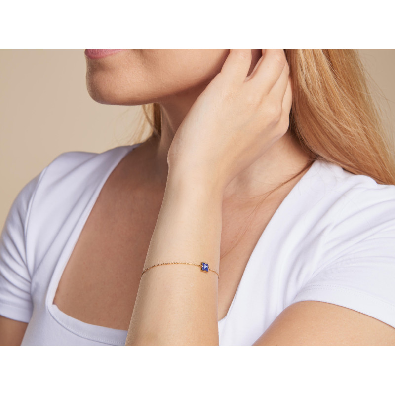 Kvadratni oblik i bogata plava boja lapis lazulija čine ovu narukvicu profinjenim, ali upečatljivim dodatkom svakoj kolekciji nakita. Prong setting osigurava sigurnost kamena, dok pozlaćeno srebro pruža dugotrajan sjaj i izdržljivost. Podesiva duljina omogućava savršeno pristajanje za svaku ruku.