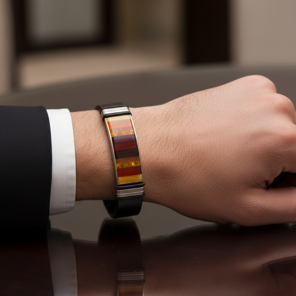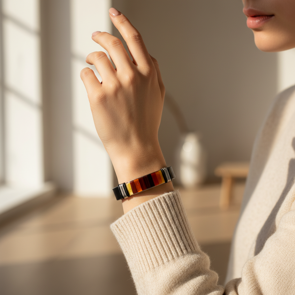 Otkrijte bezvremensku eleganciju s ovom unisex narukvicom s prirodnim višebojnim jantarom iz Baltičkog mora. Svaki pravokutni kamen ističe jedinstvenu ljepotu jantara, nudeći živopisan dašak boje koji nadopunjuje svaku odjevnu kombinaciju. Svojim podesivim dizajnom, ovaj komad osigurava savršeno pristajanje, što ga čini svestranim dodatkom vašoj kolekciji nakita.